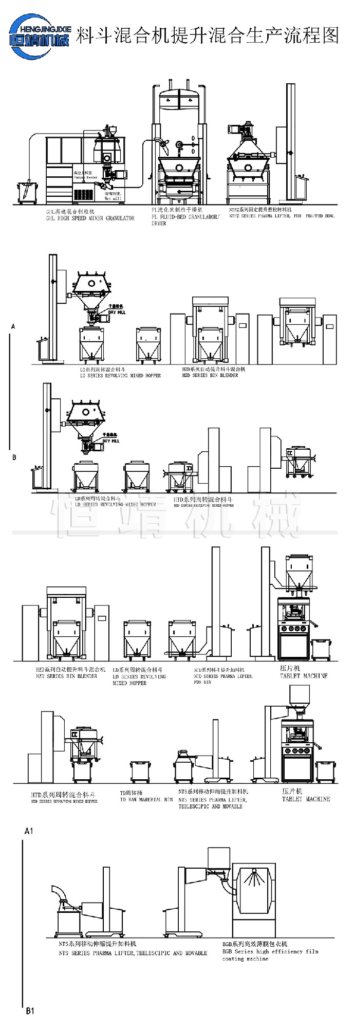将配备好物料的周转料斗推至与湿法制粒机机旁→向湿法制粒机中真空加料→经过制粒→湿整粒→干燥→物料提升(干物料)整粒→干整完后的颗粒落入周转料桶→接料结束将周转料桶推至总混合机提升加料至总混料筒→总混后的物料分料落入周转料斗→将周转料斗通过提升向压片机(或胶囊充填机)加料→使用后的料斗推到清洗中心清洗。