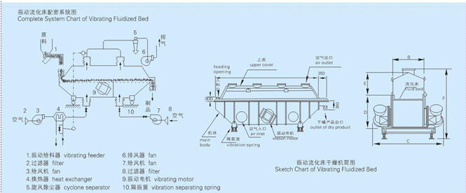 物料自进料口进入机内, 在振动力作用下, 物料沿水平方向抛掷向前连续运动,热风向上穿过流化床同湿料换热后, 湿空气经旋风分离器除尘后由排风口排出, 干燥物料由排料口排出。